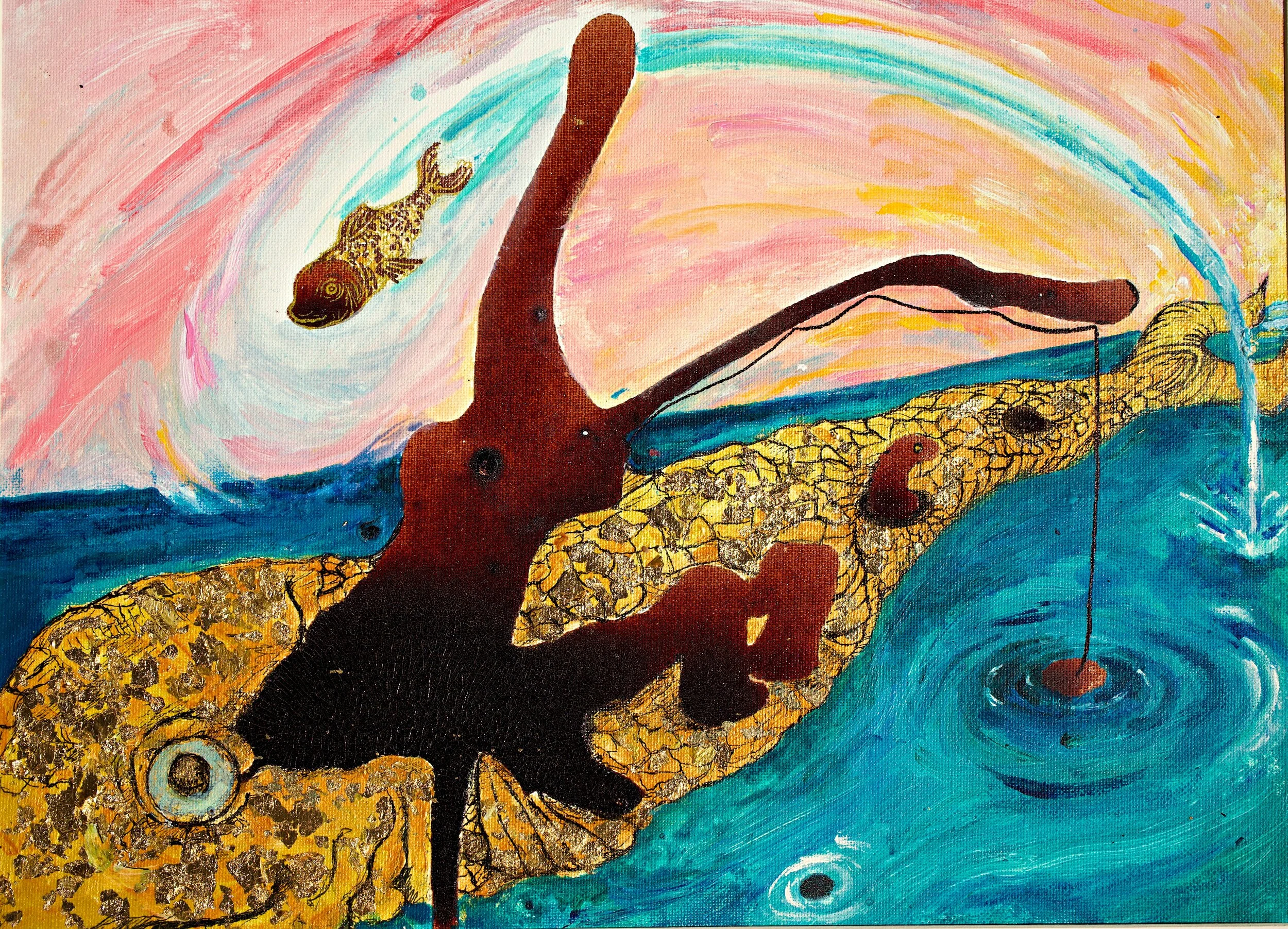 ‘Fishing on a Fish. Flying Fish’ A4 Canvas board, menstrual blood, acrylics & pen.